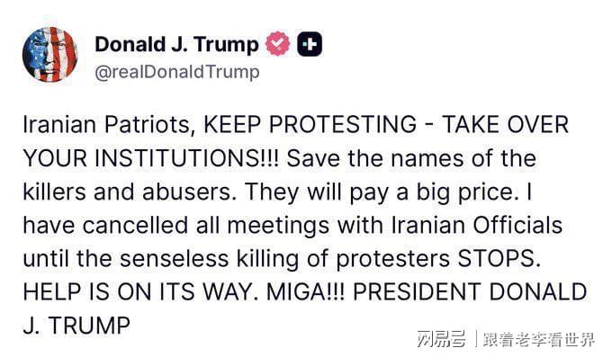 “伊朗爱国者们,继续抗议——接管你们的机构!记住那些杀人犯和施暴者的名字。他们将付出巨大代价。在对抗议者的无谓杀戮停止之前,我已取消与伊朗官员的所有会面。帮助即将到来。MIGA!!!